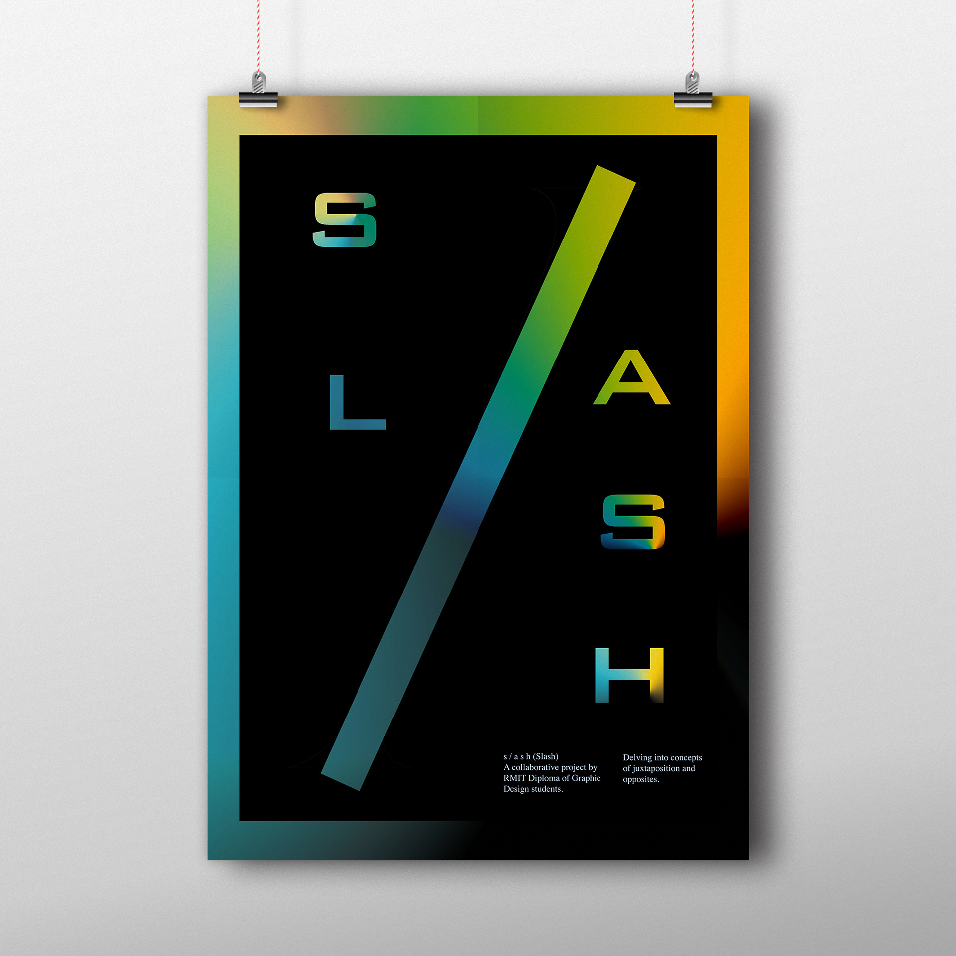 Poster of my proposed front cover for the RMIT Diploma of Graphic Design project, s / a s h (slash). Publication content delves into concepts of juxtaposition and opposites.